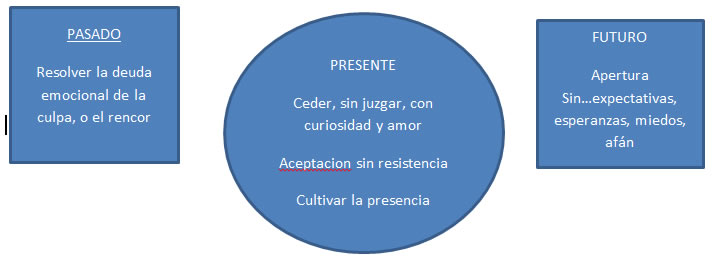 Soltar: en multitud de ocasiones, nos vemos lastrados por numerosos pensamientos, recuerdos dolorosos, expectactivas, planificaciones, deseos…, que nos impiden desasirnos de una realidad contaminada de malestar. Si por el contrario, aprendemos a soltar aquello que no aporta claridad a las cosas y que nos permita avanzar ligeros ante el presente, podremos sentirnos más libres y con menor estrés.